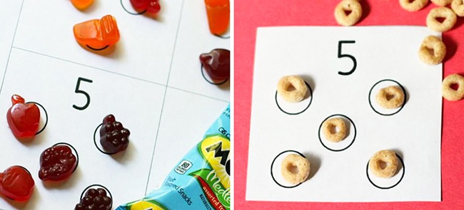 Đây là loại bài tập toán học sẽ làm cho bất kỳ đứa trẻ nào cũng thấy hứng thú. Hãy chuẩn bị một số tờ giấy, vẽ những vòng tròn với số lượng khác nhau lên đó rồi hướng dẫn trẻ tập đếm với kẹo. Bạn có thể thay thế kẹo bằng bất kỳ đồ ăn nào mà trẻ thích – hoa quả, trái cây, hoặc bánh quy giòn…