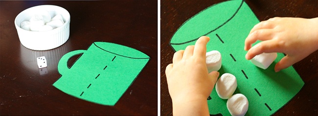 Đây sẽ là cách đếm yêu thích cho những đứa trẻ hảo ngọt, mà trẻ con thì hầu như bé nào cũng rất thích đồ ngọt. Bạn hãy cắt hình một chiếc cốc giấy lớn, bảo bé tung xúc xắc và cho số kẹo dẻo tương ứng với con số tung được lên trên chiếc cốc giấy đó. Và tất nhiên, hãy thưởng cho bé một chút kẹo khi bé làm đúng, sẽ chẳng có em bé nào lại không cố làm cho tốt đâu.