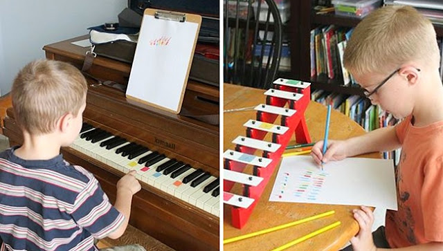 Dán những mẩu giấy màu có ghi các con số lên phím đàn và yêu cầu con bạn chọn đúng phím để đánh khi bạn đưa ra dãy số nào đó. Học toán kết hợp với âm nhạc sẽ khiến môn học trở nên sinh động hơn, và mẹo hay ở đây là bạn đọc những con số phù hợp để các phím đàn đánh lên một giai điệu quen thuộc, bé của bạn sẽ rất hứng thú và như vậy bạn vừa giúp bé làm quen với các con số, vừa giúp bé phát triển cảm thụ âm nhạc.