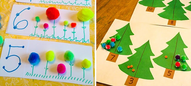 Nếu bạn có những cục bông gòn màu sắc, hãy sử dụng chúng để giúp bé làm thành khu vườn nhỏ của riêng mình. Bạn cũng có thể sử dụng miếng giấy màu hình tròn hay thậm chí là cúc áo hay bất kỳ thứ gì phù hợp và nhiều màu. Viết các chữ số ở dưới thân cây và yêu cầu con bạn để đúng số đồ trang trí lên tán cây.