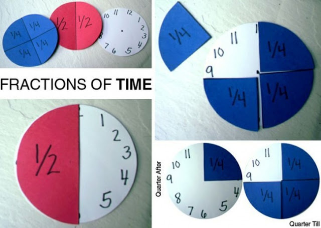 Với những bé đã học đến phân số và cách đọc đồng hồ, bạn có thể chia nhỏ mặt đồng hồ ra thành các phần đều nhau như thế này và giải thích cho bé.