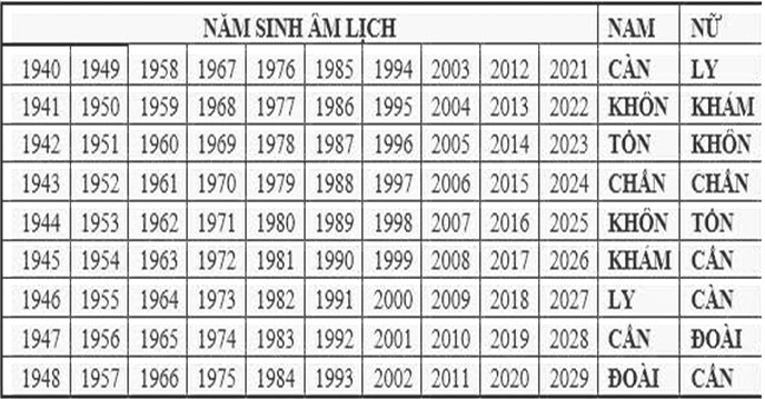 Mọi người dò năm sinh của mình rồi nhìn sang cột nam/nữ để có cung mệnh. Sau đó đối chiếu kết quả của vợ chồng với nhau, mọi người sẽ được kết quả: