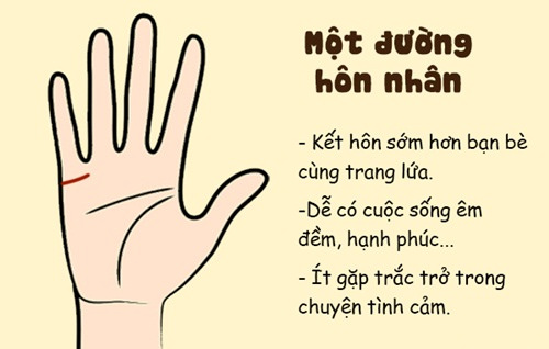Nếu bạn chỉ có một đường hôn nhân thì đường này thường rất rõ ràng, tách biệt với những đường vân tay khác. Nó nói lên rằng bạn có thể dễ dàng tìm thấy nửa kia của mình, kết hôn và có một cuộc sống hạnh phúc. Người thuộc nhóm này thường ít gặp trắc trở trong chuyện tình cảm, đặc biệt lại dễ kết hôn sớm hơn bạn bè cùng trang lứa.
