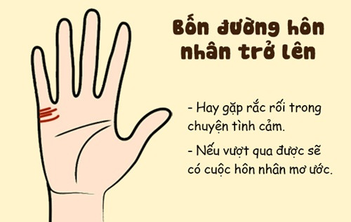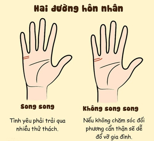 Chú ý:– Khi xem, bạn chỉ cần đếm những đường vân rõ ràng, có xuất phát từ cạnh bàn tay.– Nếu có nhiều đường nhỏ mờ hơn chồng chéo lên, điều đó dự báo rằng cuộc hôn nhân của bạn có thể gặp những rắc rối do người khác gây ra. Lúc này, bạn chính là người sẽ quyết định vận mệnh của cuộc hôn nhân đó. Giữ được hay không, nắm hay buông, tất cả đều phụ thuộc vào bạn.“Lửa thử vàng, gian nan thử sức”, đừng bao giờ khuất phục trước những khó khăn, thử thách. Sớm muộn gì bạn cũng tìm được tình yêu đích thực và có được hạnh phúc của đời mình thôi!