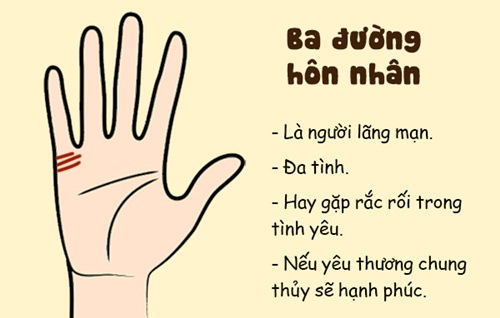 Những người có ba đường hôn nhân thường rất lãng mạn trong tình yêu. Bạn dễ được nhiều người đem lòng yêu mến bởi sự nồng nàn từ trong chính tính cách. Có thể nói, bạn cũng khá đa tình, lại được rất nhiều người theo đuổi. Tuy nhiên, bạn lại rất thông minh, khôn ngoan nên biết cách tránh được những rắc rối trong chuyện tình yêu, chuyện tình tay ba… Dù sao thì cũng khuyên bạn nên chọn ra người mình yêu thực sự, yêu chân thành và chung thủy, có như vậy thì hạnh phúc mới lâu dài.